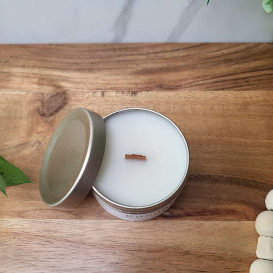 These 2 oz frosted gold tins are made with our premium coconut soy wax and wooden wicks, and last for up to 10+ hours!